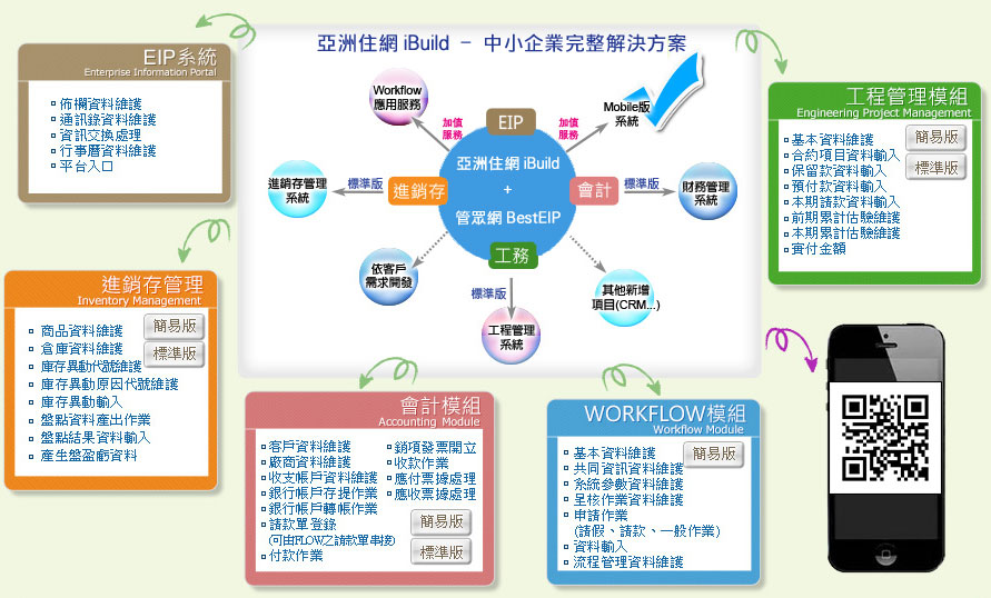 考量國內中小企業之特色與需求,亞洲住網科技 開發推出【亞洲住網iBuild專業錦囊】之中小企業ERP系統及營建業、營造業之工務系統,工務工程系統,工務工程管理系統。並針對國內中小企業提供免費財務管理,免費會計管理,免費進銷存管理,免費財會,進銷存系統及會計系統之免費服務。